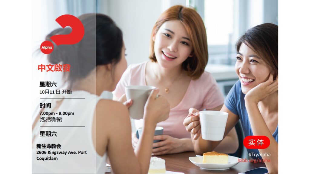 【2025下半年的教會中文啟發(Alpha)聚會】將於10/11 – 11/22 期間、每周六晚上7點到9點舉行。 誠摯邀請慕道友和未信主的朋友參加。㇐起晚餐,看影片,聊㇐聊信仰與人生, 認識耶穌,得蒙救贖。報名請洽陳中㇐執事,電話:778-900-4594 。