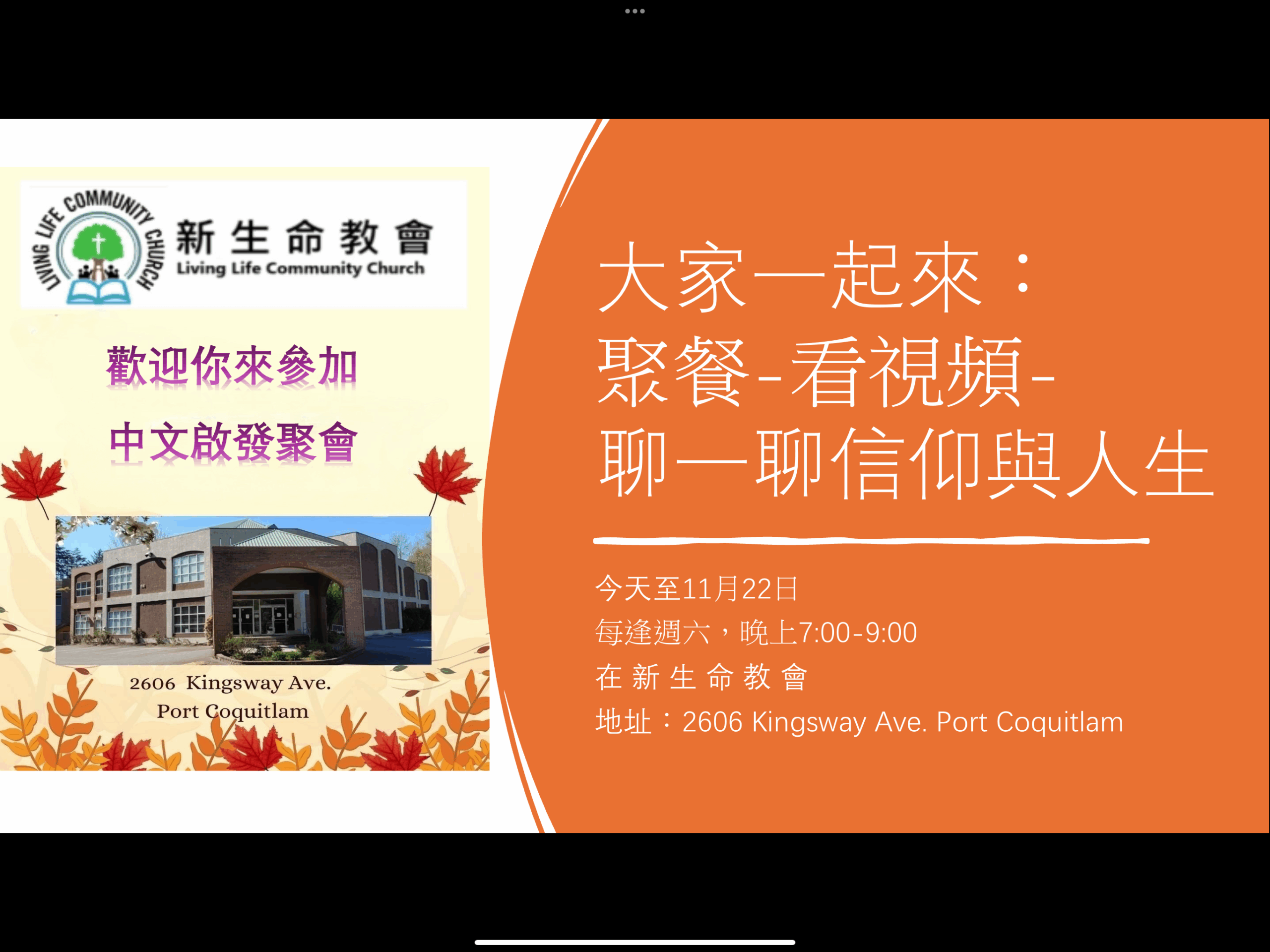Welcome to invite relatives and friends to attend Living Life Community Church’s English Sunday Worship and Youth Sunday School!